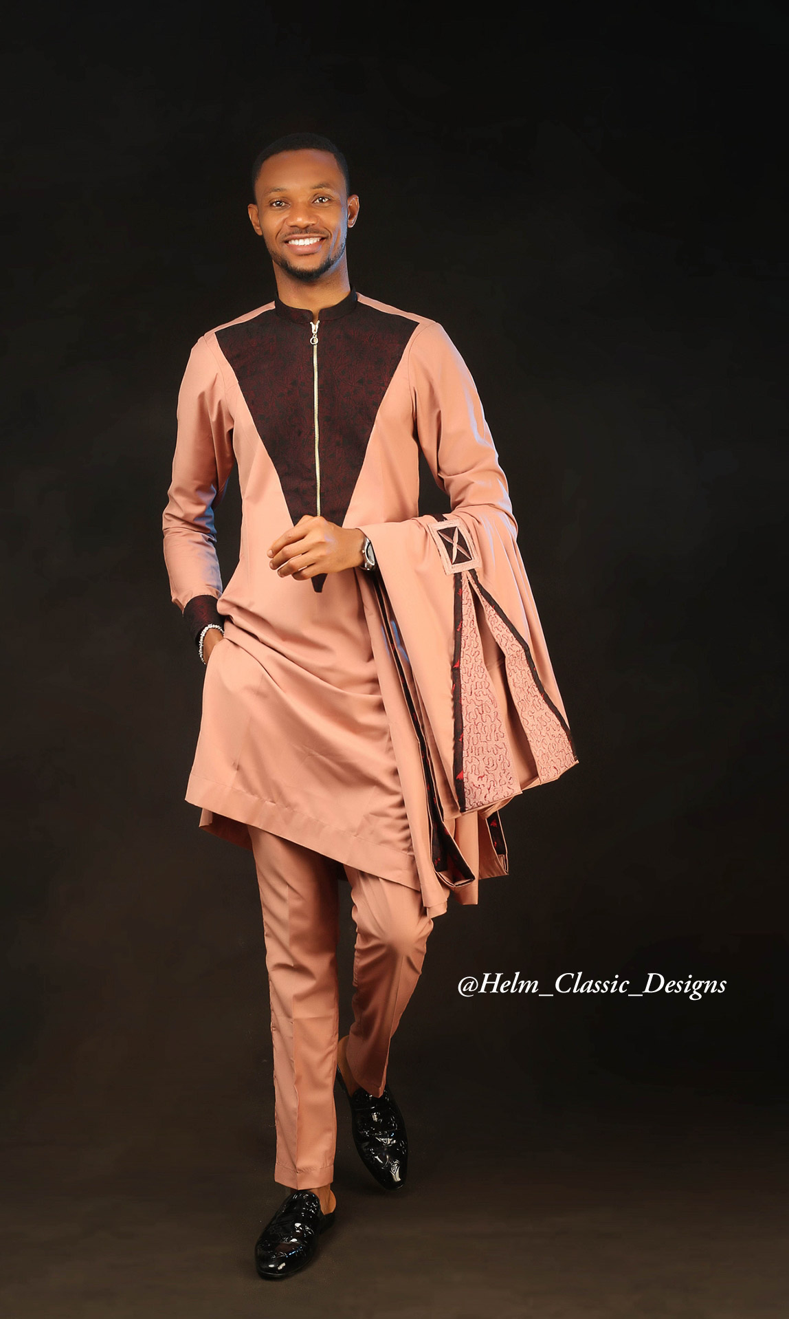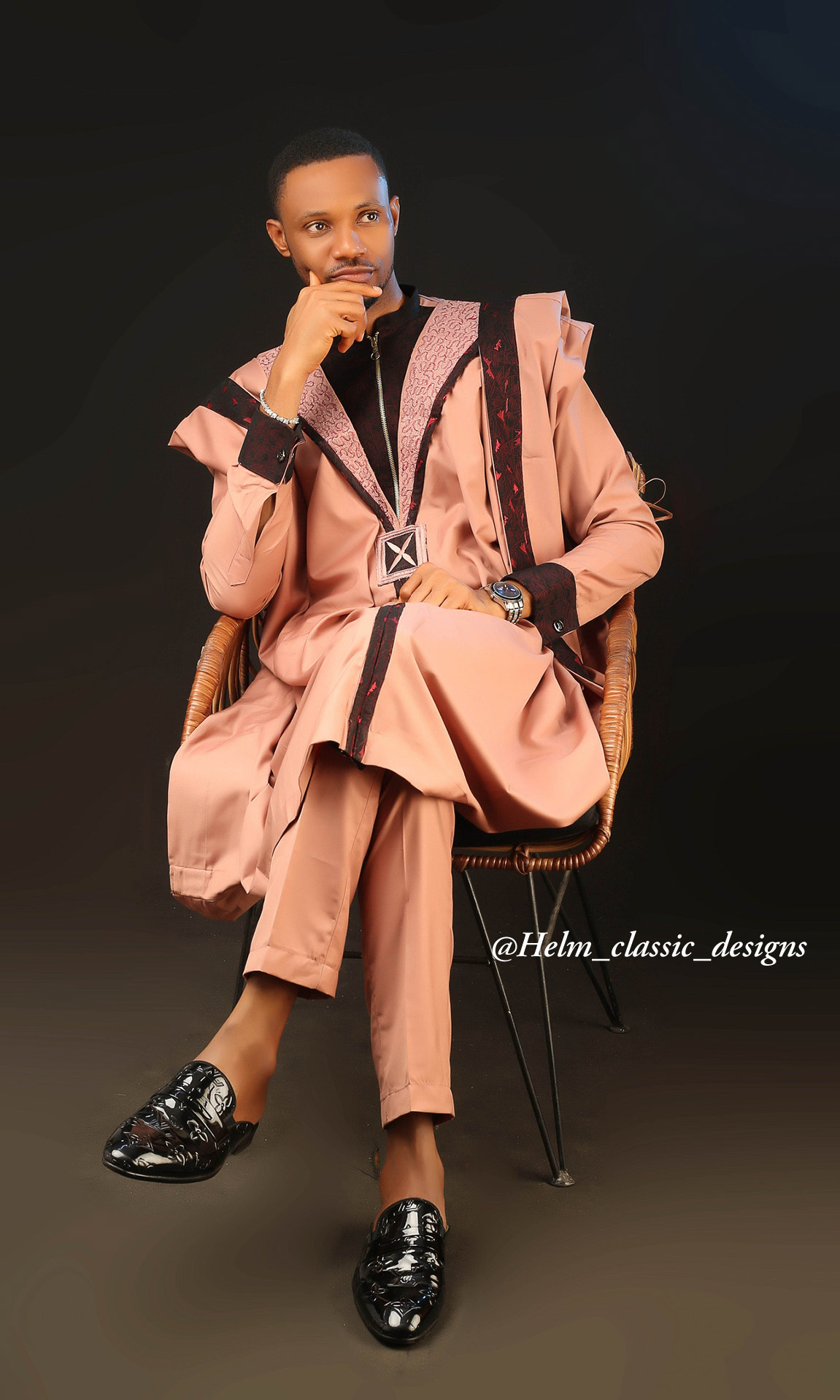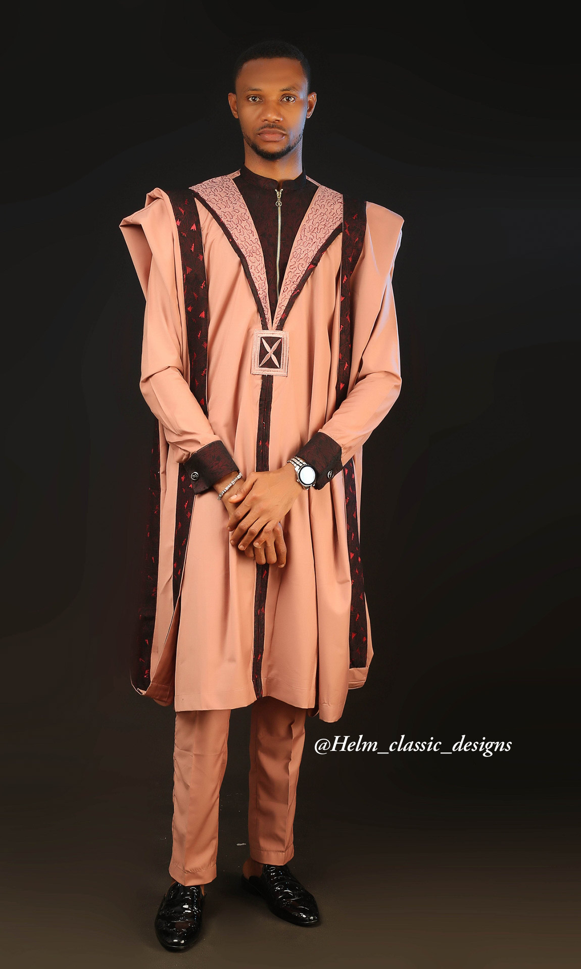A bronze coloured agbada, lined with a deep rusted brown damask to add brilliance and depict royalty. The contemporary suit pattern depict a blend of modern day fashion without losing touch of the traditional agbada.