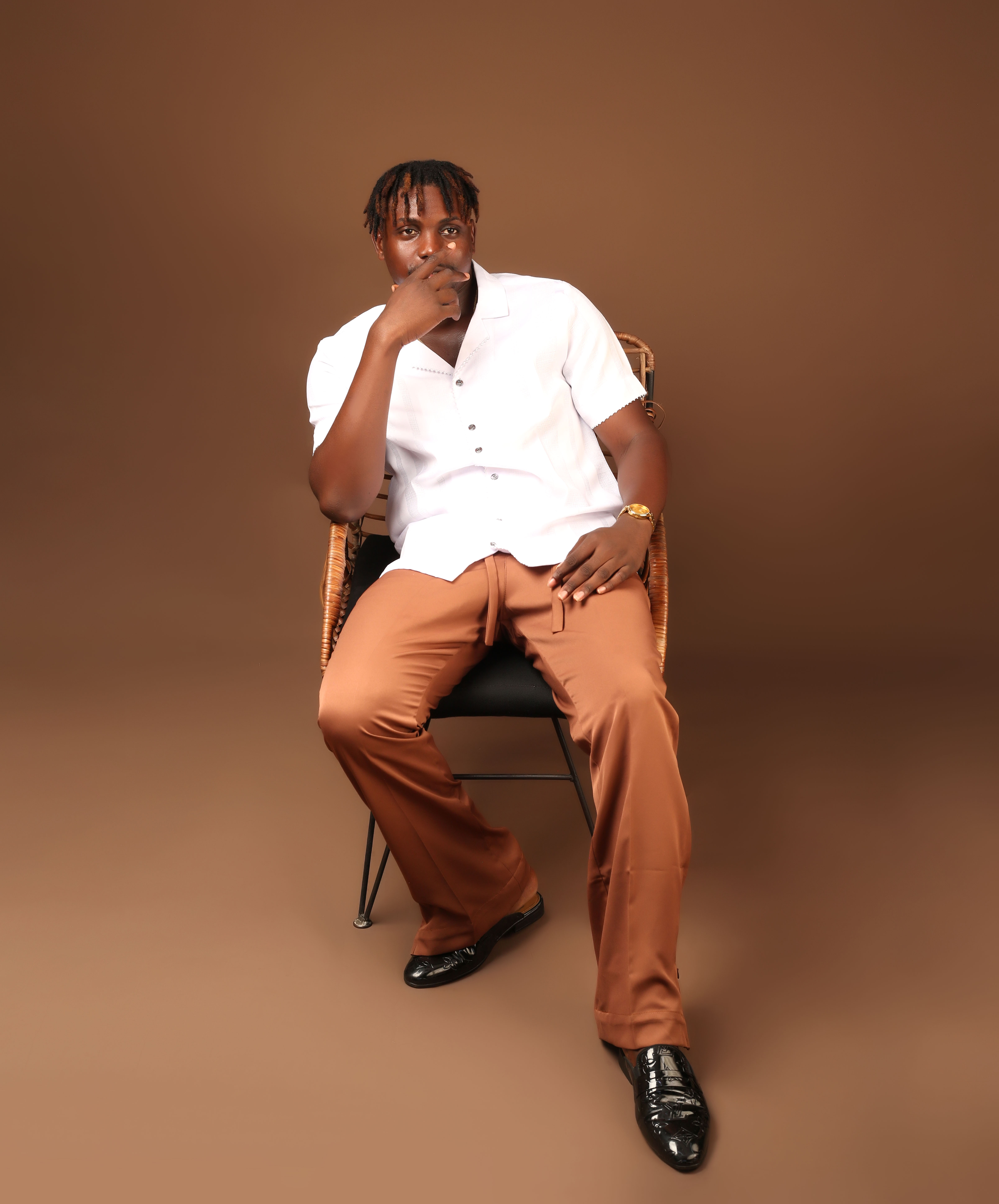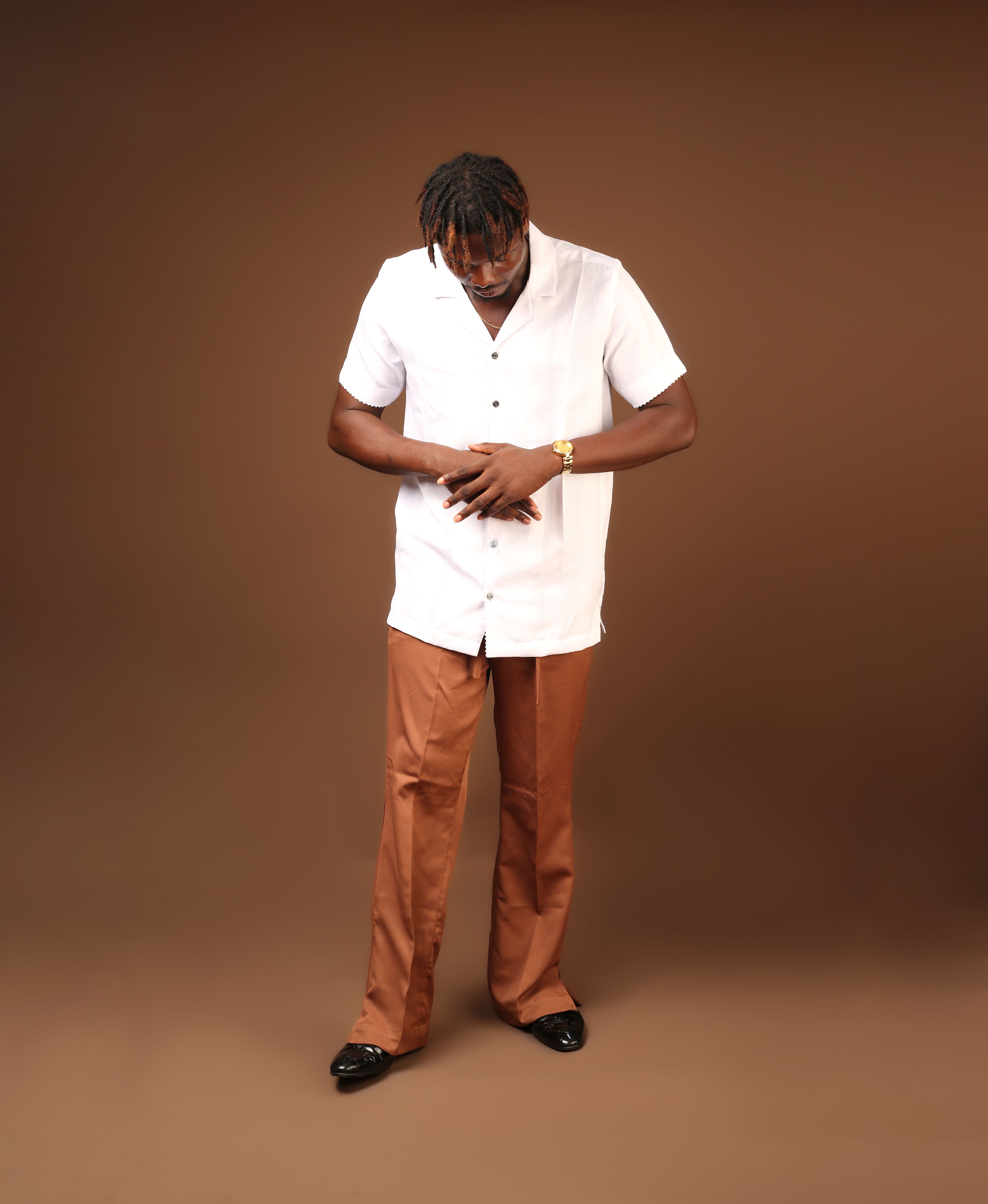 The blend of Swiss White Kanali material made into a shirt and chocolate brown pant.